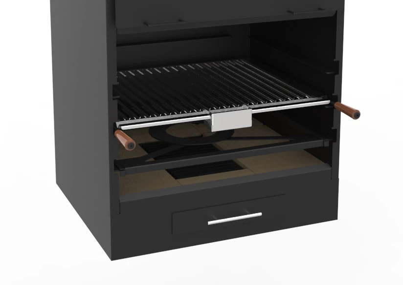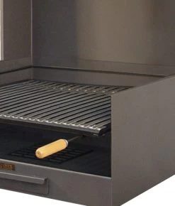 – Parrilla de cocción de Acero Inoxidable tipo Argentina (con varillas en forma de V) y recoge-grasas regulable a 3 alturas: 62,5 x 55 cm (ancho x fondo).