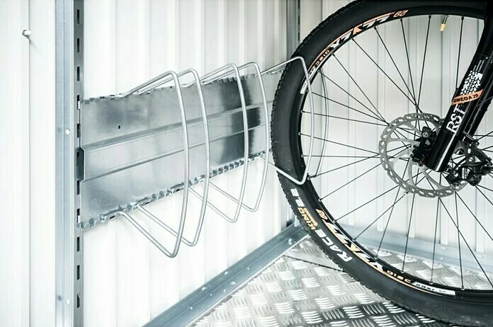 El soporte para bicicletas de Biohort te permite estacionar tus bicicletas de forma óptima en las casetas para herramientas Biohort Avantgarde y Europa o Highboard. Una vez que la placa base de los soportes ha sido fijada a los dos soportes verticales de los estantes, los neumáticos de bicicleta se pueden fijar rápida y fácilmente a ellos. Este set permite el enganche de hasta dos bicicletas.