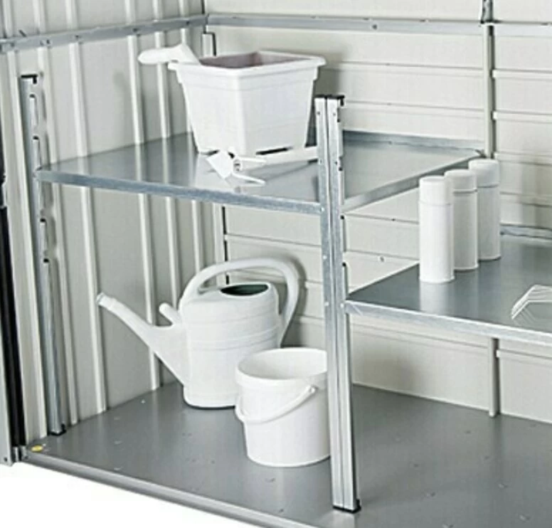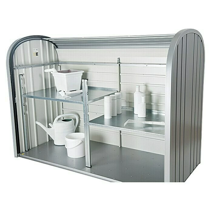 La balda intermedia para StoreMax de Biohort se compone de dos estantes de acero galvanizado en caliente con soportes para estantes. Es regulable en altura en 5 posiciones y puede ser fácilmente instalado. También se puede utilizar como una estantería de 2 niveles. La capacidad de carga es de aproximadamente 100 kg.