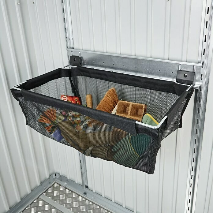 La cesta colgante de Biohort con riel de trenzado de poliéster negro ofrece espacio de almacenamiento adicional para piezas pequeñas y puede soportar una carga máxima de 10 kg. El modelo es adecuado para los cobertizos de jardín Biohort y los armarios de jardín.