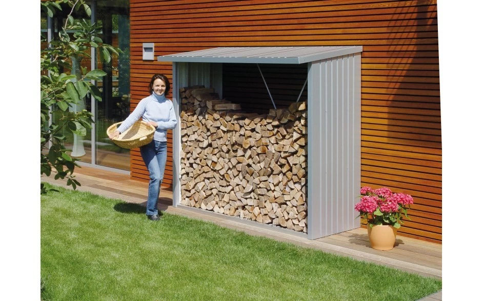 Especialmente práctico demuestra ser el cobertizo para leña perfecto para situarlo junto a la casa. El panel posterior adicional protege el muro de la casa de las erosiones que pueda producir la leña almacenada.