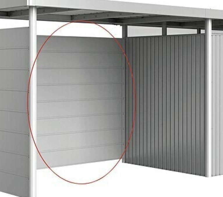 El panel trasero H2 – H5 de Biohort se adapta perfectamente a los techos laterales H2 – H5 y ofrece una protección adicional contra la luz solar en verano y contra la lluvia y el viento en los días más frescos. Fabricado en chapa de acero galvanizado en caliente con un grosor de pared de 5 cm, es especialmente duradero. La pared lateral está disponible en un color a juego con el color de la casa y se puede reequipar en pocos pasos gracias al sistema inteligente de tornillos enchufables.