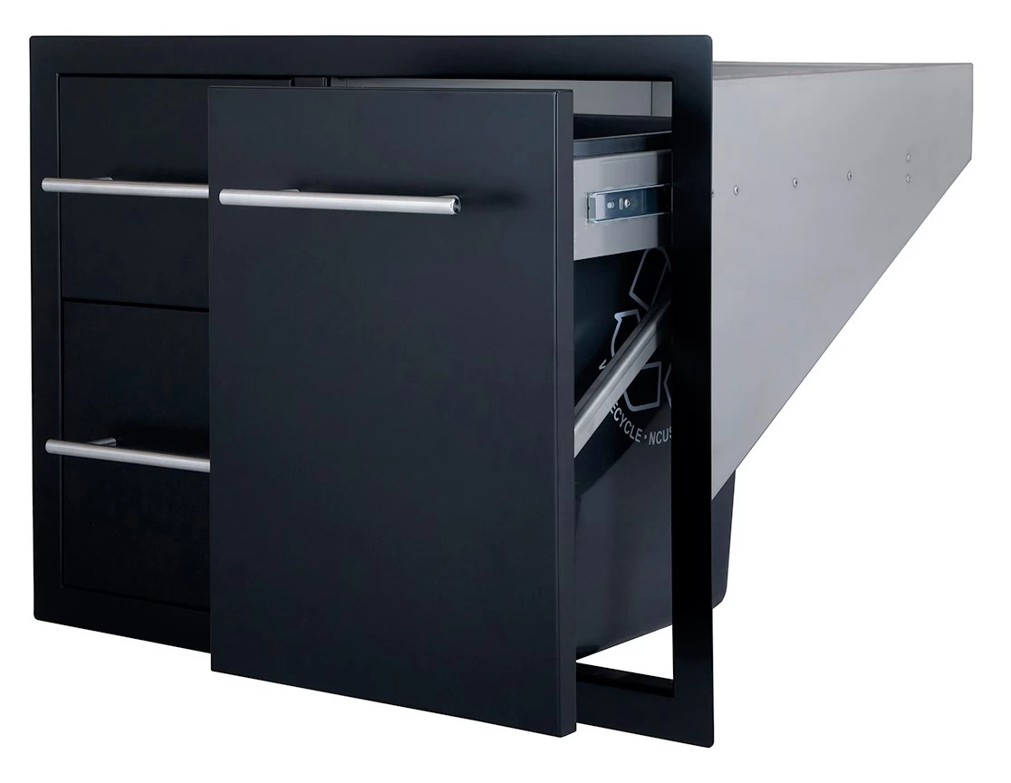 La cajonera doble + cajón para la botella de gas o el cubo de basura está fabricada de Acero Inoxidable esmaltado en negro y con los tiradores de acero pulido. Una vez instalada queda completamente a ras, así que es perfecta para diferentes tipos de superficies como piedra, cemento, etc.