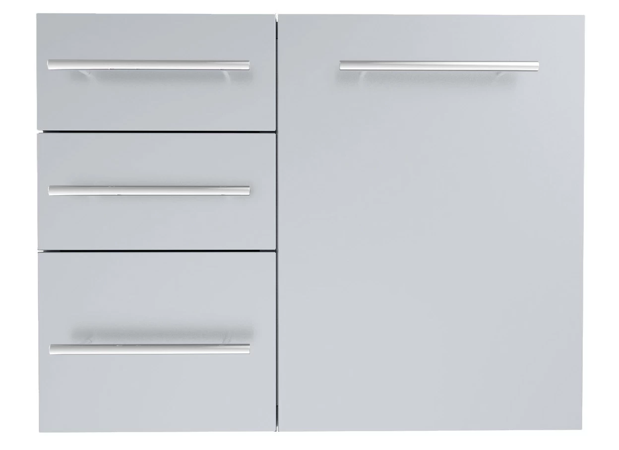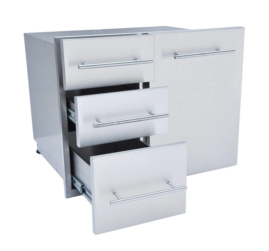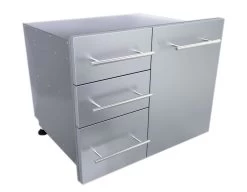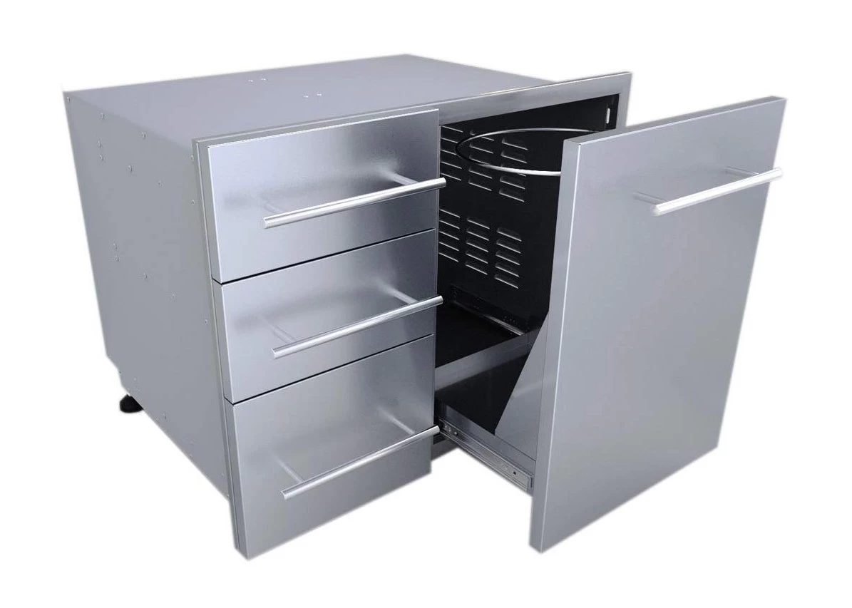El cajonero triple + cajón botella gas o cubo basura Designer Series está fabricado con el mismo acabado que las barbacoas Sunstone y con el tirador de acero pulido.