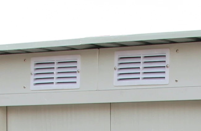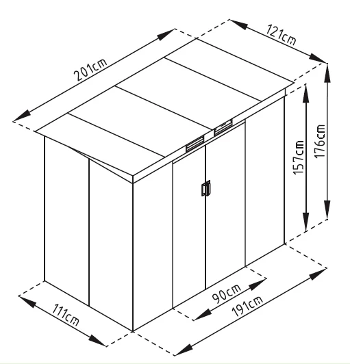 El modelo de caseta metálica Buckingham está fabricado en Acero Galvanizado y pre-tinte en caliente. Cuenta con paneles laterales nervados, puerta corredera doble, y tejado a un agua.