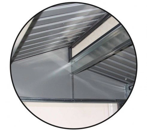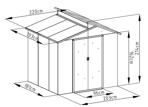 El modelo de caseta metálica Chester está fabricado en Acero Galvanizado y pre-tinte en caliente. Cuenta con paneles laterales nervados, puerta corredera doble, tejado a dos aguas, y tragaluz de policarbonato. Incluye desagüe pluvial para drenar rápidamente el agua de lluvia.