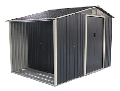 El modelo de caseta metálica Ontario está fabricado en Acero Galvanizado y pre-tinte en caliente. Cuenta con paneles laterales nervados, puerta corredera doble, tejado a dos aguas, y la gran ventaja de incorporar un anexo de almacenaje exterior y protección.