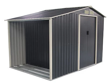 El modelo de caseta metálica Toronto está fabricado en Acero Galvanizado y pre-tinte en caliente. Cuenta con paneles laterales nervados, puerta corredera doble, tejado a dos aguas, y la gran ventaja de incorporar un anexo de almacenaje exterior y protección.