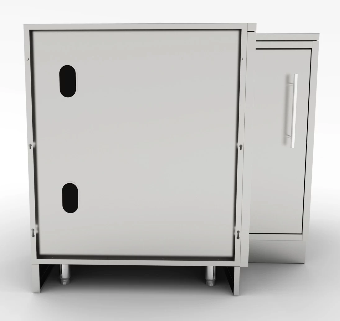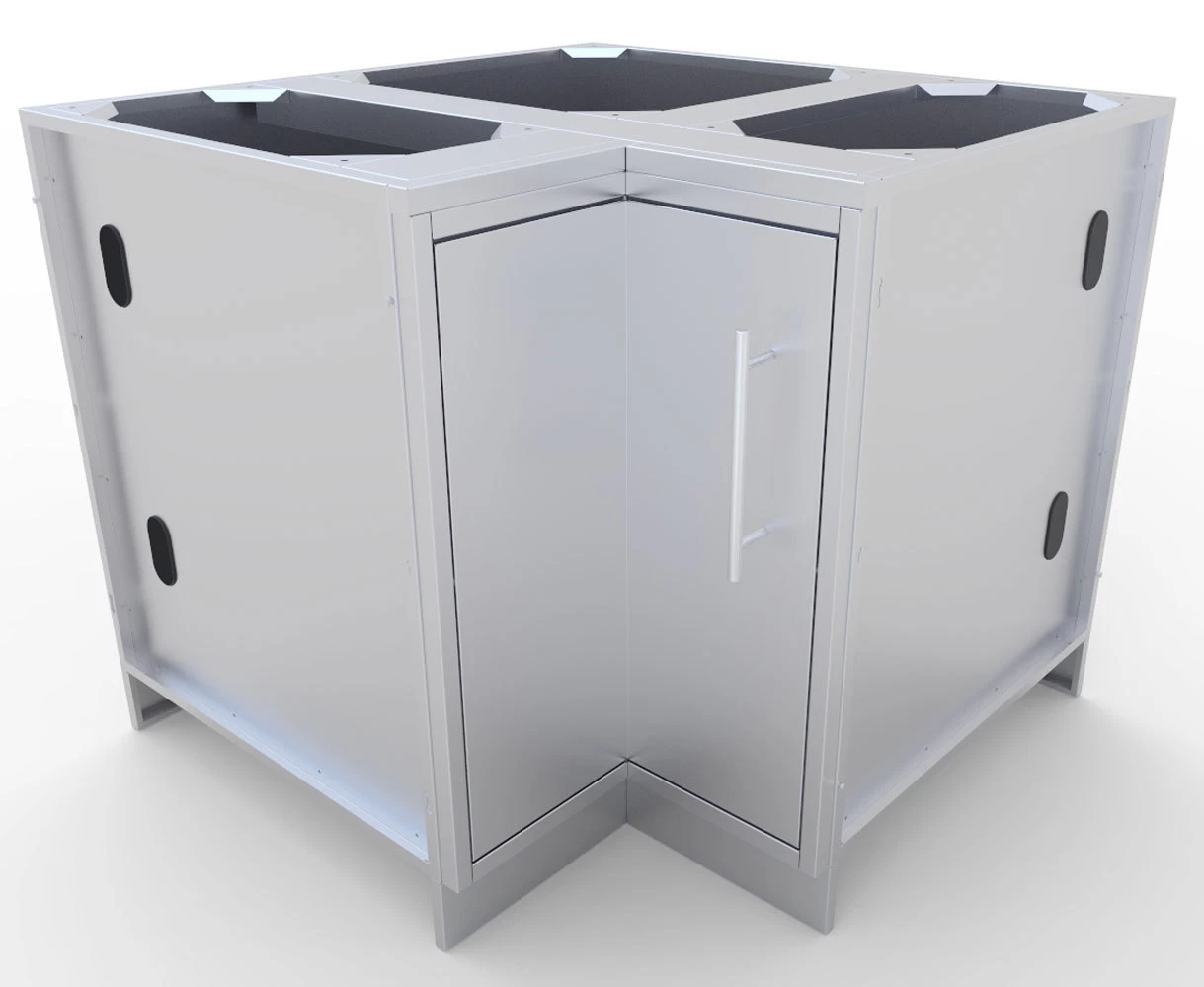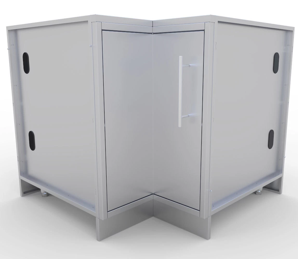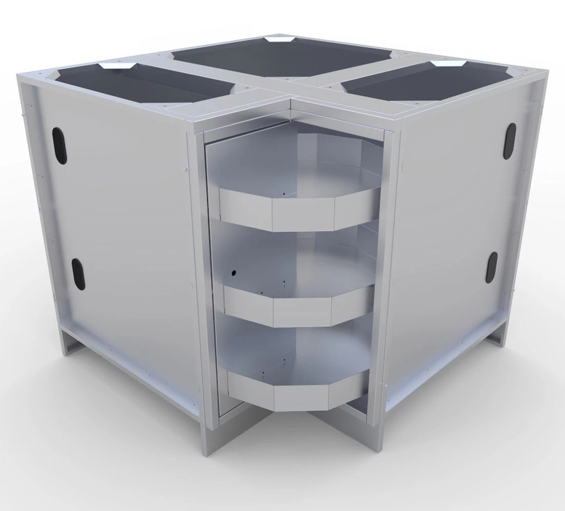 El módulo Inox. rinconera está construido enteramente de Acero Inoxidable grado 304 del calibre 16 y 18 y se caracteriza por su gran capacidad de almacenamiento interior y su hueco ya preparado para colocar un fregadero o un quemador lateral de encastrar. Incluye tres repisas «Lazy Susan» rotatorias de 360 grados insertadas en el marco de la puerta frontal, ideales para almacenar nuestros útiles y consumibles y protegiendo estos de cualquier elemento de la intemperie cuando la puerta esté cerrada.