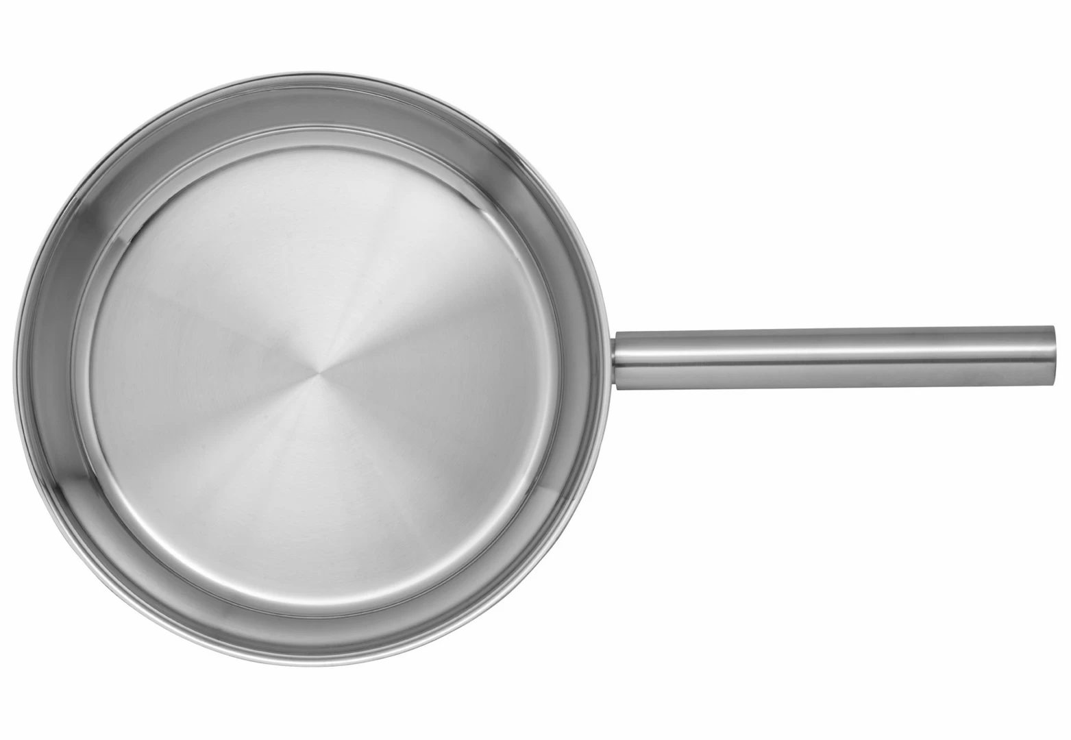 Las sartenes de acero inoxidable 100% reciclado de primera calidad. Creadas para el chef profesional. Y para los chefs profesionales en casa. Con un fondo tipo sándwich de 6 mm de grosor, tiene una distribución perfecta del calor. ¿Busca la sartén ideal para freír filetes? Esta es la ideal. Apta para cualquier fuente de calor, incluso inducción y horno.