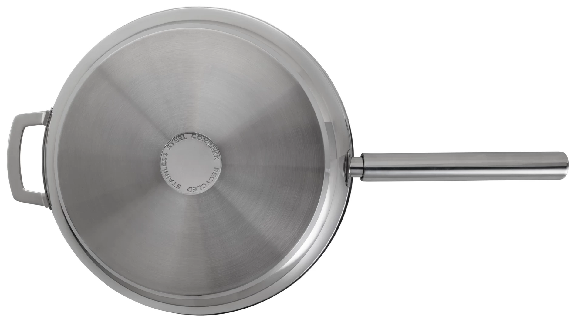 Las sartenes de acero inoxidable 100% reciclado de primera calidad. Creadas para el chef profesional. Y para los chefs profesionales en casa. Con un fondo tipo sándwich de 6 mm de grosor, tiene una distribución perfecta del calor. ¿Busca la sartén ideal para freír filetes? Esta es la ideal. Apta para cualquier fuente de calor, incluso inducción y horno.