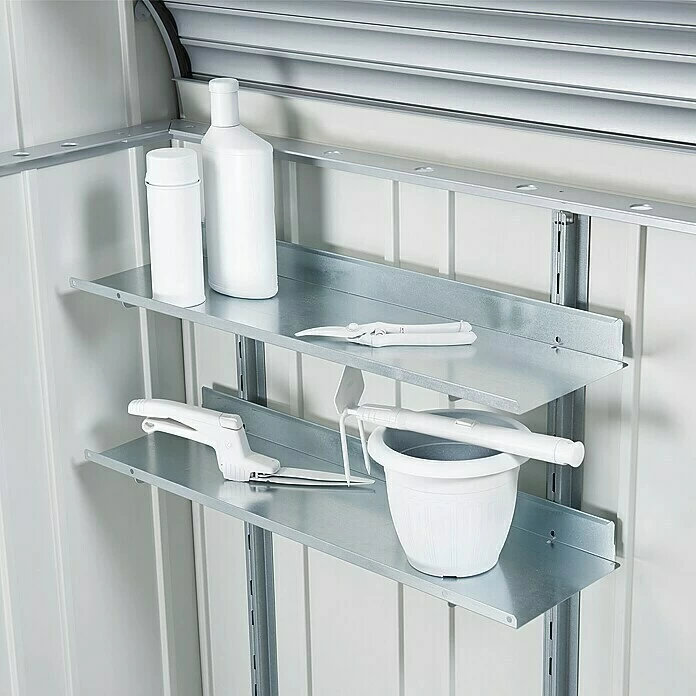 El set de estanterías de Biohort consta de dos estantes de acero galvanizado en caliente diseñados para adaptarse al Armario de Jardín Romeo y al StoreMax en sus respectivos tamaños. Debido a la composición del material, el set de estanterías tiene una gran capacidad de carga y estabilidad. Proporciona más orden y un mejor uso del espacio y se integra ópticamente de manera ideal en el moderno Armario Romeo y StoreMax.