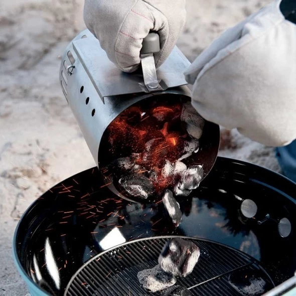 Carbón ardiente en menos de 20 minutos sin necesidad de utilizar liquido de encendido. Coloque la chimenea con carbón encima de los cubitos de combustible Weber o papel de periódico arrugado y encendido. ¡Así de fácil!